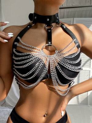 Aggiunge un tocco di eleganza al tuo gioco bondage e sicuramente valorizzerà il tuo seno. Gli anelli in metallo e le nappe in catena d’argento creano un’estetica punk rock unica e seducente.